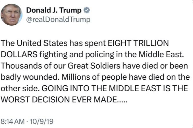 ¹Ανάρτηση από Ignorance, the root and stem of all evil (@ivan_8848)Ignorance, the root and stem of all evil (@ivan_8848) δημοσίευσε στο 1:19 μ.μ. on Σάβ, Ιουν 14, 2025: THROWBACK: Donald Trump has a message for Donald Trump “Our president will start a war with Iran because he has absolutely no ability to negotiate. He’s weak and he’s ineffective,” Trump said back in 2011 https://t.co/UurhDovNfE(https://x.com/ivan_8848/status/1933831707913851204?t=njAl-GHg0Wdq46xlQIeQDQ&s=03)