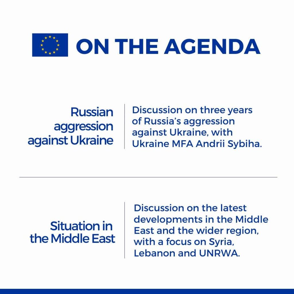 On the third year mark of Russia’s full scale invasion of Ukraine, EU Foreign Affairs Ministers will discuss the Russian aggression against Ukraine, after an informal exchange of views with the Minister of Foreign Affairs of Ukraine Andrii Sybiha, via videoconference.