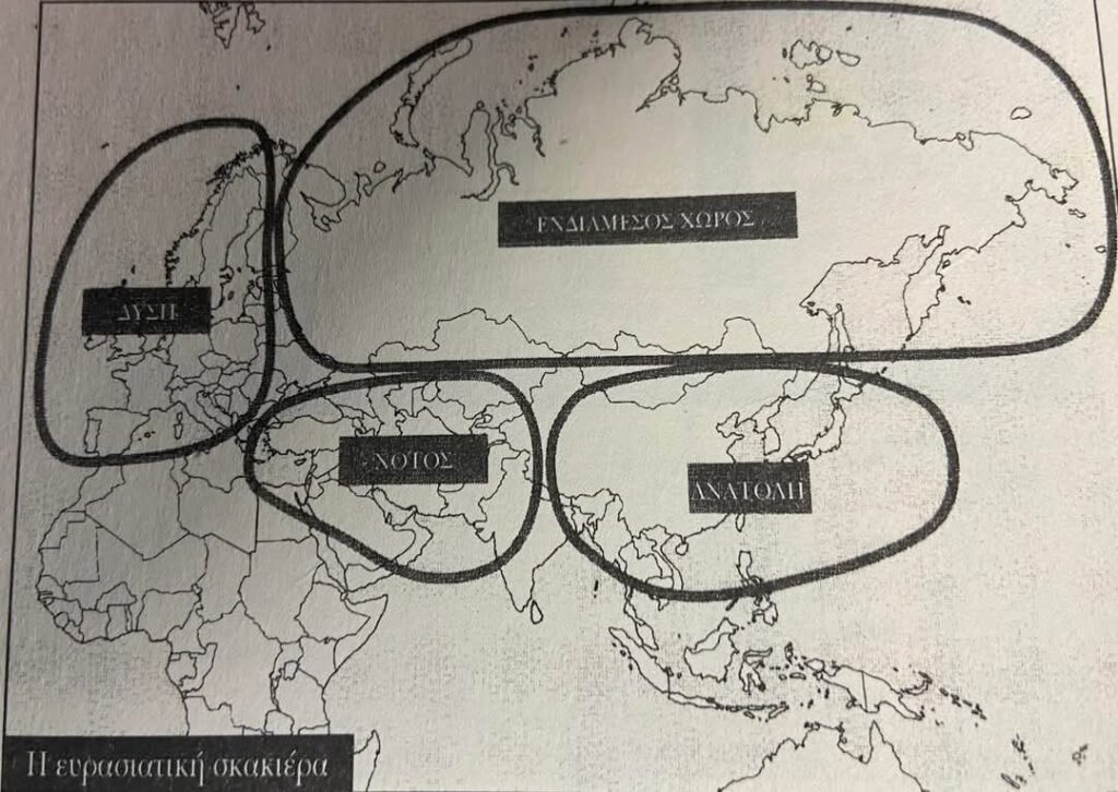 – Στις τέσσερεις υπό περιφέρειες της Ευρασιας που ανήκει γεωγραφικά η κάθε αναθεωρητική δύναμη (τρίτη είκονα) υπάρχει μια εστία έντασης ή σύγκρουσης: Δυτική και Ενδιάμεση (Ρωσία-πόλεμος στην Ουκρανία), Νότια (Τουρκία-ανταγωνισμός στην Ανατολική Μεσόγειο και Ιράν-πόλεμος στη Μέση Ανατολή), Ανατολική (Κίνα-πίεση σε Ταϊβαν και προσπάθεια κυριαρχίας στη Νότια Σινική Θάλασσα).