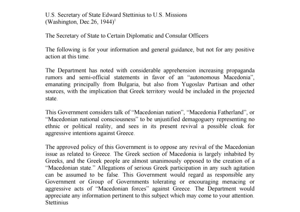 Τον Δεκέμβριο του 1944 τηλεγράφημα του State Department προς τις αμερικανικές Αρχές, με υπογραφή του τότε Αμερικανού Υπουργού Εξωτερικών Stettinius, έγραφε, μεταξύ άλλων, ότι: «Η (αμερικανική) Κυβέρνηση θεωρεί ότι αναφορές του τύπου ‘μακεδονικό έθνος’, ‘μακεδονική Μητέρα Πατρίδα’ ή ‘μακεδονική εθνική συνείδηση’ αποτελούν αδικαιολόγητη δημαγωγία που δεν αντικατοπτρίζει καμία πολιτική πραγματικότητα και βλέπει σε αυτές την αναγέννηση ενός πιθανού μανδύα που θα υποκρύπτει επιθετικές βλέψεις εναντίον της Ελλάδας».
