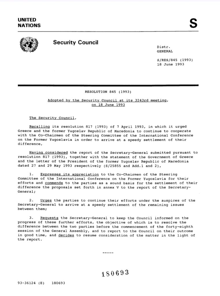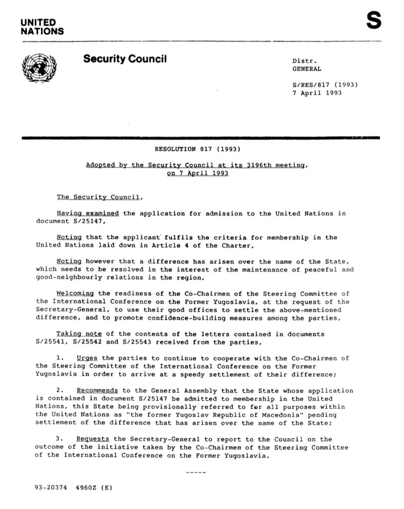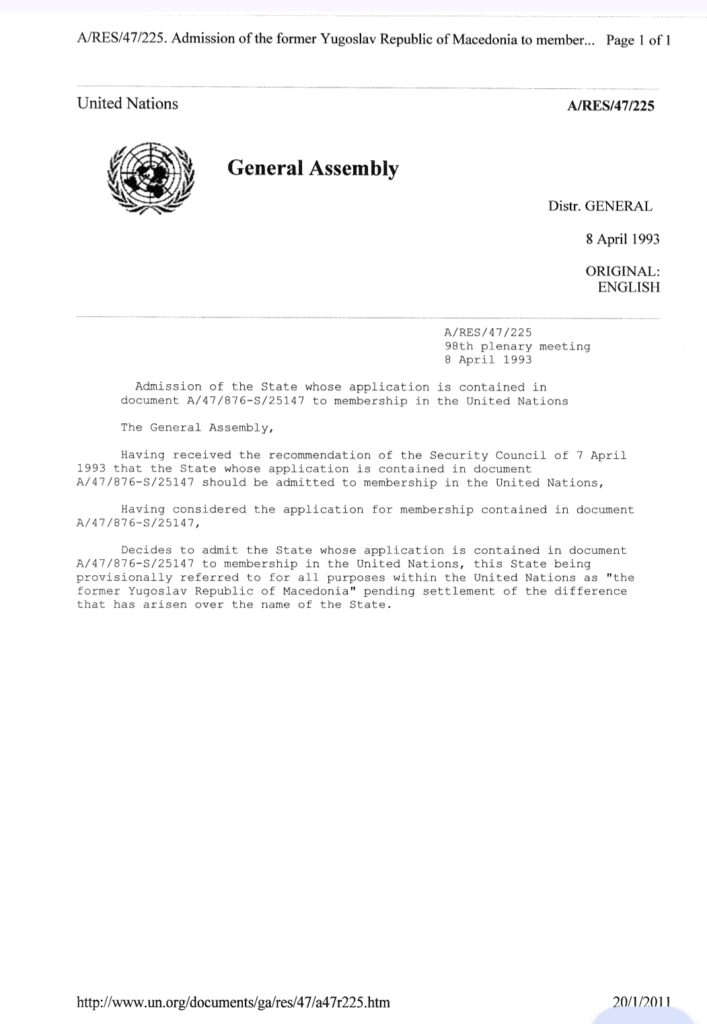 Το 1993, κατόπιν της σύστασης του Συμβουλίου Ασφαλείας, η γειτονική μας χώρα έγινε δεκτή, με απόφαση της Γενικής Συνέλευσης, στα Ηνωμένα Έθνη με την προσωρινή ονομασία «πρώην Γιουγκοσλαβική Δημοκρατία της Μακεδονίας» έως ότου επιτυγχανόταν μια συμφωνημένη λύση.
