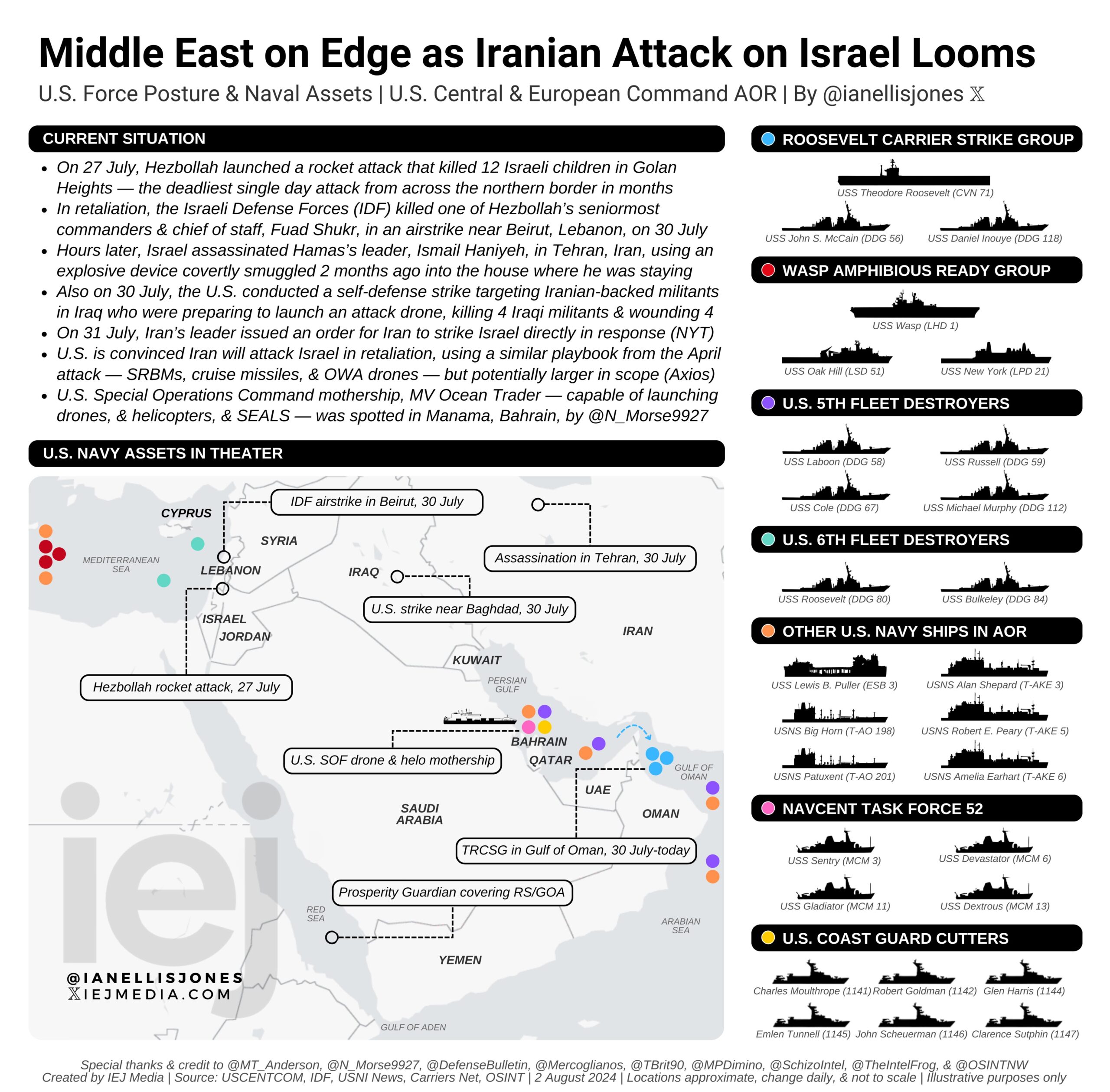 Ahead of an imminent Iranian attack on Israel in retaliation for twin assassinations, the U.S. repositioned major naval assets in theater.